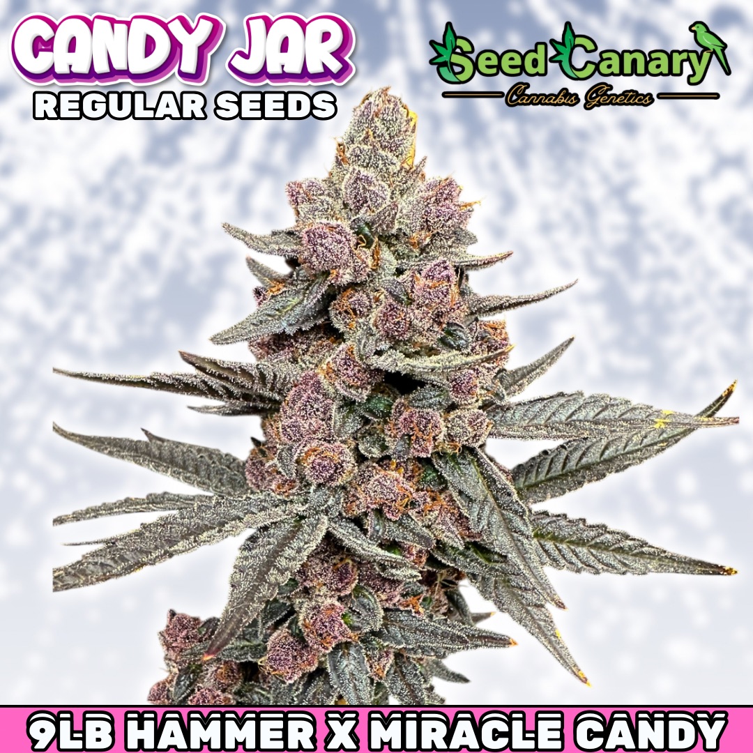 Step into a world of sugar-coated potency with Candy Jar, a mouthwatering cross of 9lb Hammer and Miracle Candy. This unique Hybrid blends brute strength with irresistible sweetness, delivering a cultivar that’s as delicious as it is Potent. Candy Jar brings out the best of both parents: dense, frosty buds dripping with candy-like terpenes, layered over the deep relaxation and body-melting effects 9lb Hammer is known for. Expect vibrant aromas of fruity taffy, berry syrup, and sweet cream, followed by a smooth exhale that leaves a Candy finish on the palate. Growers will appreciate its sturdy structure, vigorous growth, and vibrant resin production. As a regular seed line, Candy Jar offers the full genetic spectrum—perfect for breeders seeking potent, terp-rich phenos, and for traditional growers who value strength, stability, and phenotype hunting potential.