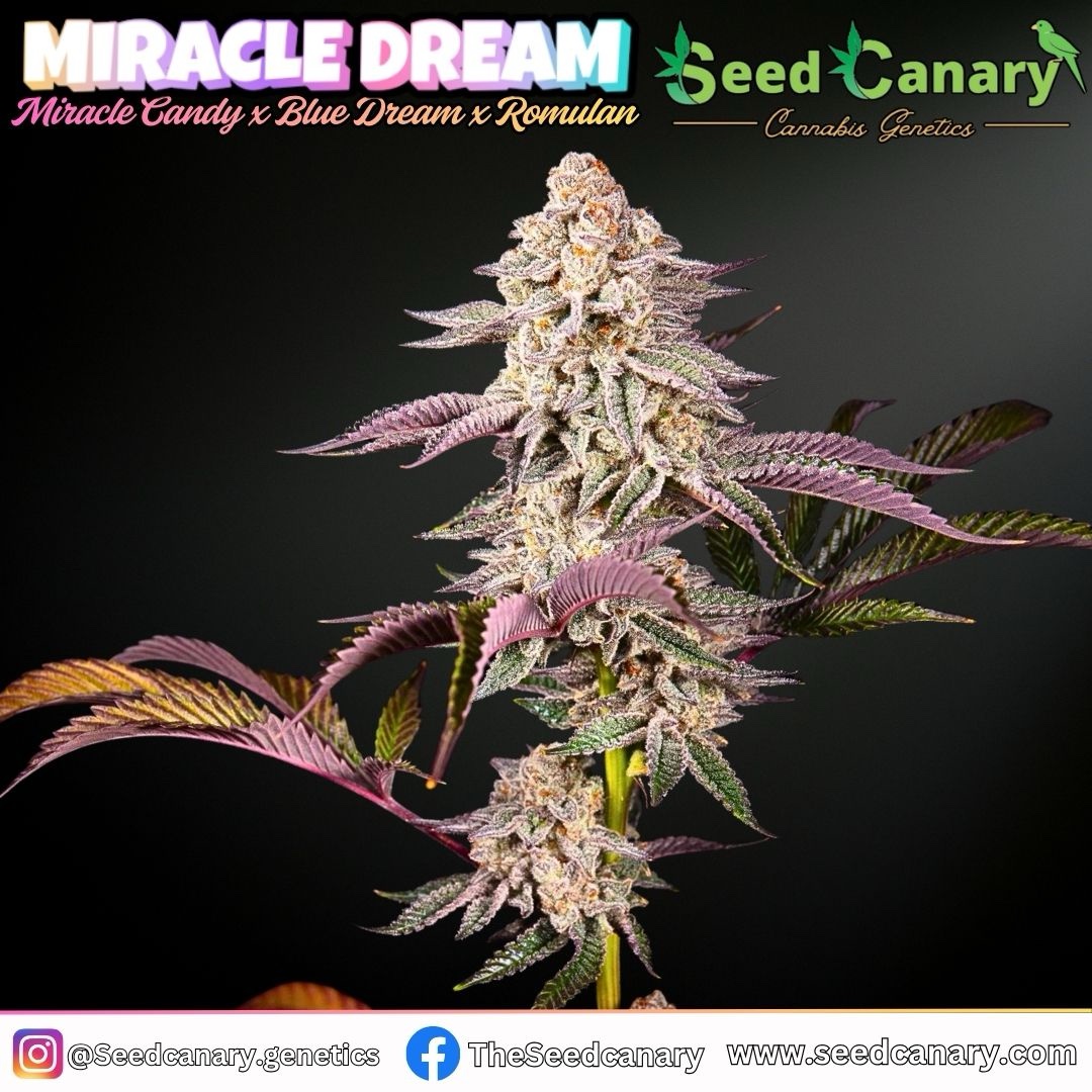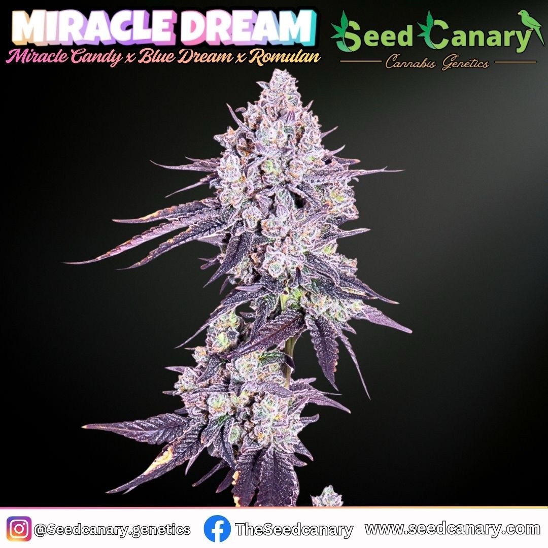 Miracle Dream is an elite hybrid cannabis strain created from Miracle Candy × Blue Dream × Romulan, combining sugary modern terpenes with classic West Coast power and old-school indica depth. These regular seeds produce both male and female plants, making them perfect for breeders, pheno hunters, and growers seeking rare, high-impact genetics.This cultivar grows with strong vigor and sturdy structure, showing both hybrid stretch and dense indica flower formation. Buds develop thick resin coverage and rich coloration, often expressing light green flowers with deep purple hues during final weeks of flower.