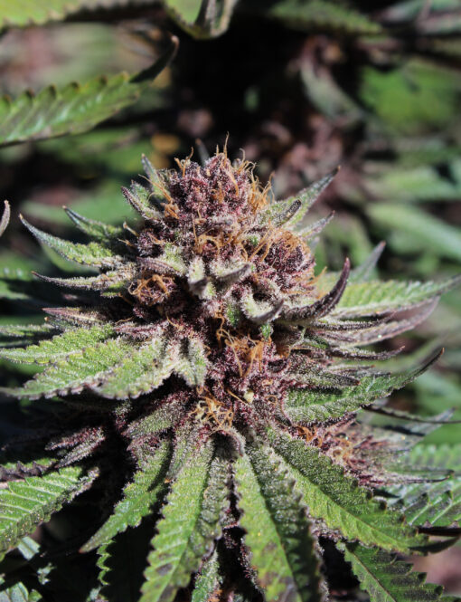 ‘Father’: Purple Pineapple Express #4 is one of our favorite plants, and she just so happens to be one of the first crosses we ever made! Nearly 10 years ago, we used a beautiful Pineapple Express female and crossed her to a special non-serrate leaf Huckleberry Hound male. Each of the Purple Pineapple Express phenotypes were extremely nice in appearance, all expressing purple flowers with huge, fat buds and exceptional yields, but we decided to keep the #4 phenotype because of her sturdy stature, fantastic bud production, her insanely resinous pewter-purple flowers, and her stellar high. We grew PPE #4 for many years until we accidentally lost her for a while, only to receive her back from a HUGE clone facility in California that we had gifted her to previously. And she came back with good news, because folks found her to be 100% resistant to powdery mildew! To us, this is one of the most special and important traits a cannabis plant can have, and is one more reason why we love PPE4 so much! This resistance to mildew was our primary motivation in using her as the pollen donor in this new fem line. She is so intolerant to powdery mildew that every plant in the garden can be completely covered in it and this plant, sitting right next to them and touching them, will NOT get it, and will stay 100% unaffected. While we imagine many of the plants in this line will show great resistance to powdery mildew, we did not purposely expose our plants to it during our trials, so we can’t speak to exact percentages or ratios of resistance, but we can say that we had zero instances of powdery mildew in our flower garden during the most critical, wet months of the cold-weather season.Generally speaking, plants from our Purple Pineapple Express line have tons of resin and color– most of the progeny produce dark buds ranging from light pink to deep, dark purple, with a couple standard green plants here and there. The fan leaves themselves are highly colorful, turning various shades of purple towards the middle to end of flower. Plants can also showcase a unique trait where the leaves are green on top and purple on the undersides. This certainly makes for a colorful garden! We also found that plants produce exceptionally nice flower structures that are large, fat, and rounded on top, just like we want them.