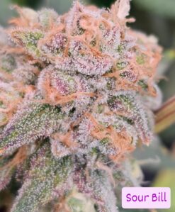 Sour Bill is heavy on Sour and Gas with fruity/candy coming in right behind it.ย . Light green W/ light purple highlights, bright peach/orange hairs. Actual picture of seeds and current phenotype I’m running above.ย