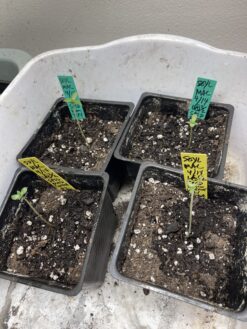 Last Photo updated was the new Soylent Mac seeds popped on , they are the 3 in the back row. The taller plants shown in the photo are 2nd image. Soylent Mac – this photo is two clones, to keep this strain going. The one on the left 2 months, it’s been topped and the one on the right is 1 month untopped. I’ve had good results with these indoor. Regular Seeds: I am releasing this strain for nostalgia purposes as I found a box of my original mixes of seeds (photo shown of containers in a box) and this one was my best accomplishment as a breeder. This seed is near and dear and it’s a little bit difficult to get a good plant, so only get this one if you like a challenge. The yield is medium but the density and terps are worth it. It’s so sticky it’s hard to trim. It took me two years to even get a seed from the original Mac Cowboy Cut strain. I originally picked it up in Oakland and had a tent full of a variety of plants and then at night i was looking at my plants with a flash light and saw these Snowballs in the midst of large dark leaves. I didn’t even try to harvest that plant in 2020, but started revegging it right away. It took a year to get clones and every time I tried to breed with it, zero, zilch. Finally I got some seeds when I mixed it with this Slurricane x OGK cross. These are not exact but actually grow a little better than the Mac in my opinion in that it’s not as bushy on the inside. Warning, not all the seeds pop and the plants that are produced may vary in character, but if you pull off a solid then it’s a winner. I popped some seeds as you can tell from the photo only have of them sprouted after 3 days. I’ll move those to dirt and let the remaining seed sit for a few more days.