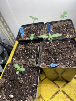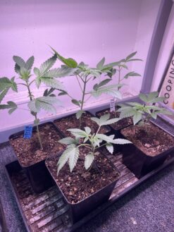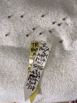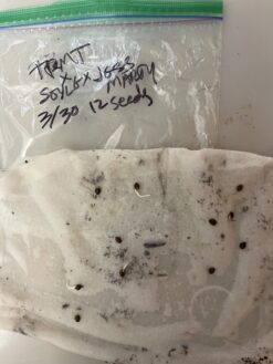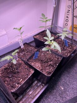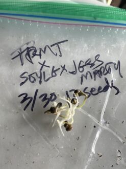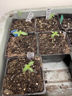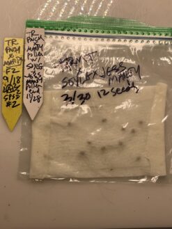 Most recent photo updated, 2 of the five are shorter and 3 in the back are taller. I’ll move them to bigger containers next week. Availability Update: I am running low / out of this strain so I raised the price for the remaining darker brown seeds to $7.50/ea, but I can only process a few more orders before I have to carefully look at the coloring of whats left. I try not to ship seeds that don’t have some stripes and aren’t on the browner side. Thanks. Testing Update: I put these in a napkin on 3/30 and in dirt on the 4/5. This updated photo inserted here 4/13. I can’t grow them out, but I am testing the vitality and making sure they are good seeds before selling too many. If you have any pics while you grow them, please forward. thanks: I’ll restock these from my inventory for sale until all the browner darker seeds are gone. Description: – Tropicana Marty (Mac – OG Kush) Female X Soylent Green (Slurricane x OG Kush) X Jungle Sunset x Marty Male —– This one is an experimental release (from solid parents) and the story goes,… Last year I gave a branch from this pollinated new strain to a grower. I don’t know how many seeds he got from the stem, but 6 months later I got a report that it was exceptional and they are now growing an entire room of the plant. I didn’t even try this one yet, so once I got the report, I dug through my seed stash to see if I stored it and this should be the one he grew from my notes. I haven’t grown it yet, so I popped some seeds to see what I get, March 30 10-12 seeds in a wet napkin. From the first batch only 4 popped right away, 3 days, and I moved them to dirt. I still have the others in the napkin, but four is enough for me to test this strain anyway. Update: I left for a few days and whoa, the rest of the seeds popped. photo attached, April 5th 6 days total before dirt. (looks like all of them popped, but 2 are missing, so 10 outta 12.) I’ll include a few extra seeds with this strain if ordered. Photos will be posted as I grow and I hope I get the same results my friend did. The other grower is more professional than me and got super solid buds out of the plant. The terps were good and an excellent balanced high. Side Note: I’ve been breeding for several years but as I’ve become successful at my other endeavor I need to exit this growing game (I still plan to grow to mix strains, just not to grow quantity for sale – I can’t compete). I will be distributing my seeds with just a handling or shipping cost one strain per week over the next 2 months. Better to distribute them than to let them sit in containers. Strain Genetics – Tropicana Marty (Mac – OG Kush) Female X Soylent Green (Slurricane x OG Kush) X Jungle Sunset x Marty Male