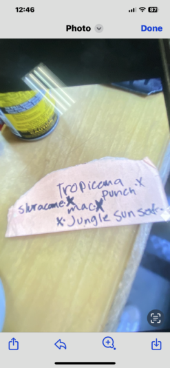 I added a pic of the tag I got back to identify the strain after my friend grew it out and gave me the raving review. This is to try and verify that it’s the same strain that my tags identify. These notes were hastily written as I didn’t think much, but when I look at how he read my chicken scratch this seems to be the same strain from my inventory. I also attached a picture of the buds that a friend of mine took when I gave him samples of this strain. I didn’t grow those buds and I don’t know what he does, but it was supposedly under Growers Choice LED lights. I wish I could get buds that solid, but I am not going to try any longer. My buds are less rock-like, but I’m not selling weed, so I don’t have to compete. I also attached a photo of the mother which is a Tropicana Marty. This has been a good yield plant and I can try to release the seeds for that one, by request. Please note my seeds are regular, not feminized.