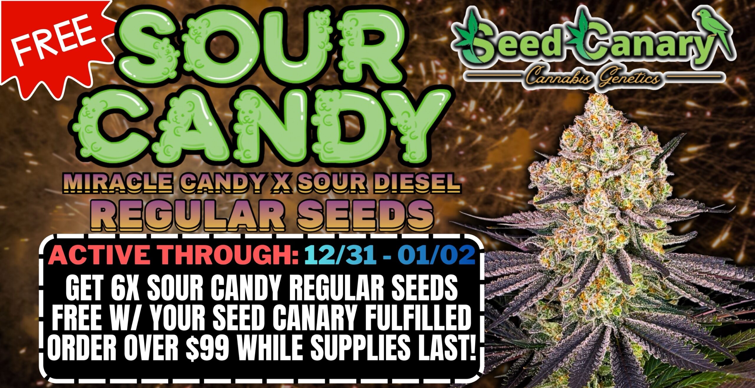 From 12/31/25 until January 2nd 2026, score 6x Sour Candy Regular Seeds FREE w/ Any Seed Canary Fulfilled Order Over $99.00 — While Supplies Last!.