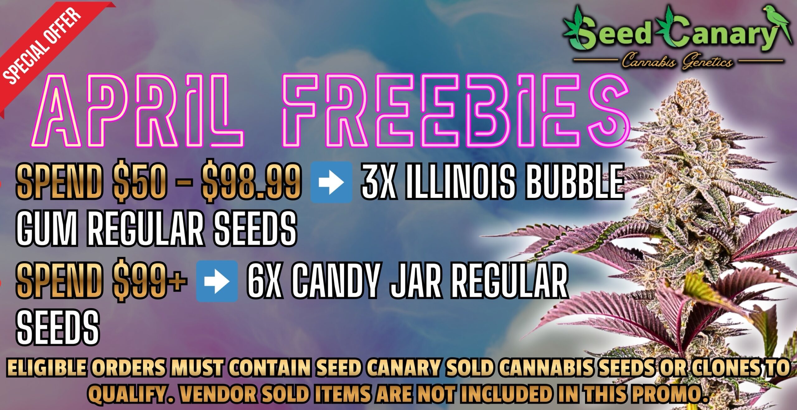 From NOW until April 20th 2026, Claim a FREE 6x Seed Pack of Illinois Bubble Gum Regular Seeds w/ Any Seed Canary Fulfilled Order OVER $40 Containing Seed Canary Genetics – Cannabis Seeds — While Supplies Last!.